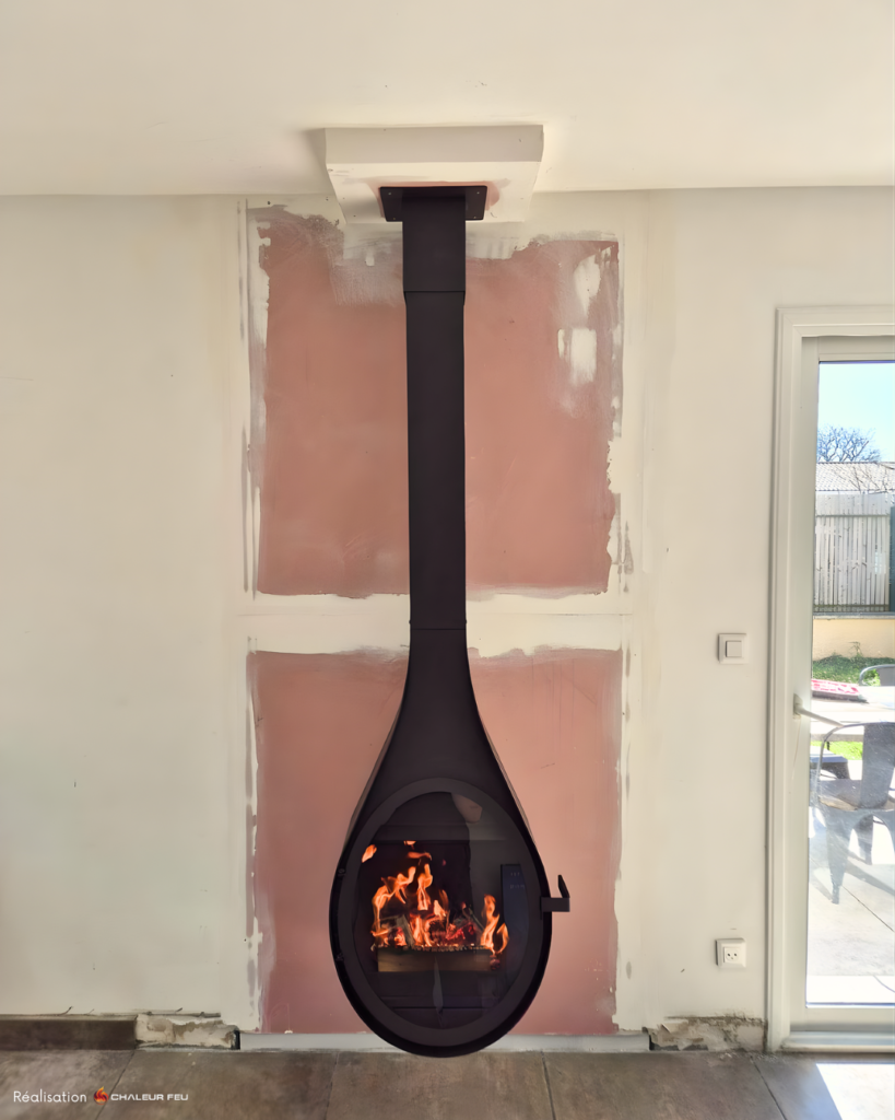 Cette installation signée Chaleurfeu ne se contente pas d’occuper l’espace ; elle le structure. En libérant le sol, le poêle suspendu permet de conserver une perspective ouverte, tout en offrant une zone de stockage pour les bûches qui souligne l’aspect naturel et authentique de l’ensemble.